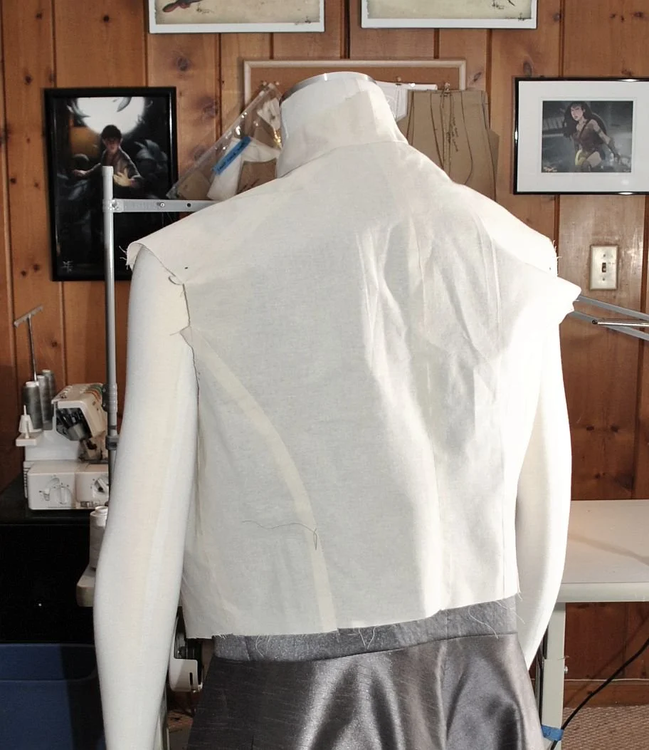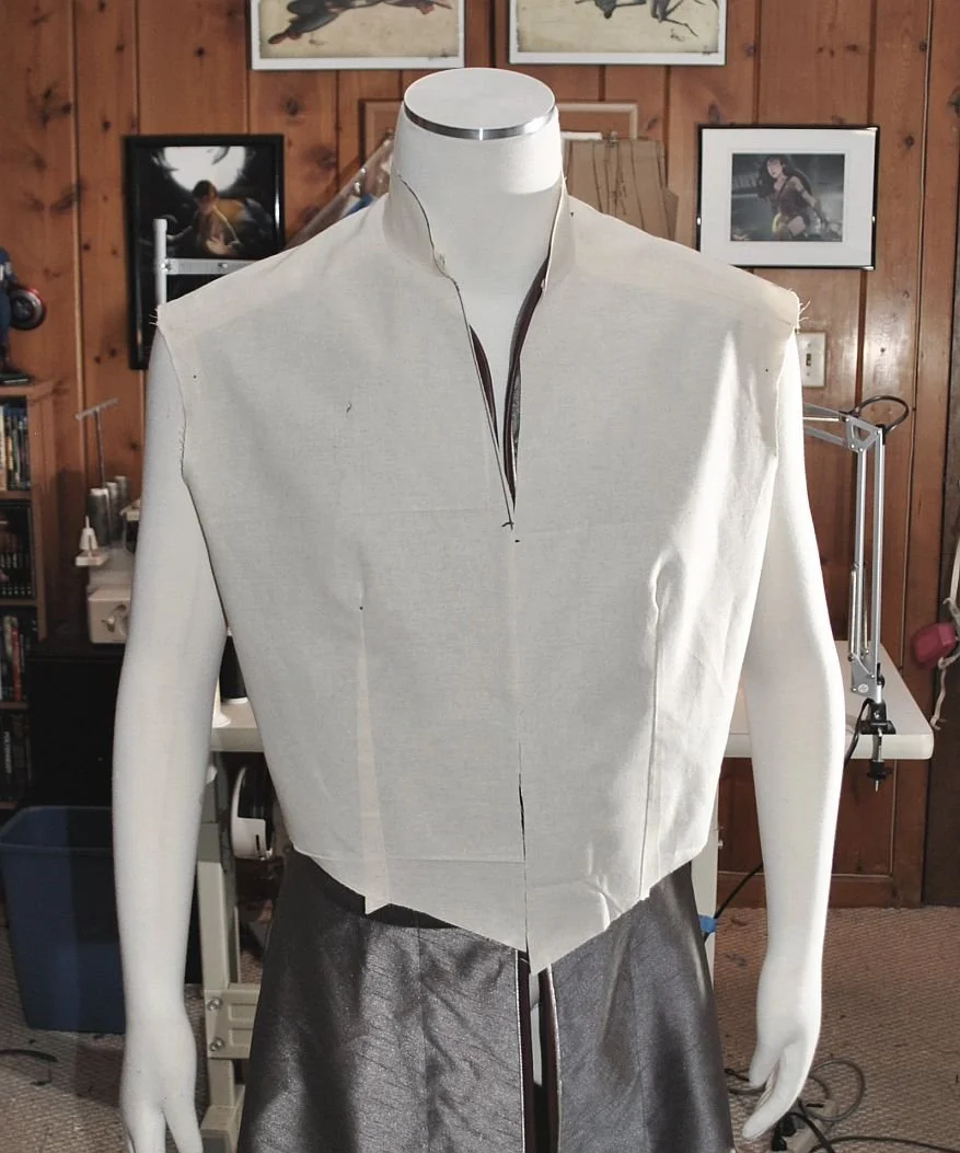 With the base robe complete, I wanted to get started on the outer robe. I decided to make this piece in ivory linen with grey accents on the edges. I started by developing a basic body pattern to fit over the grey robe.