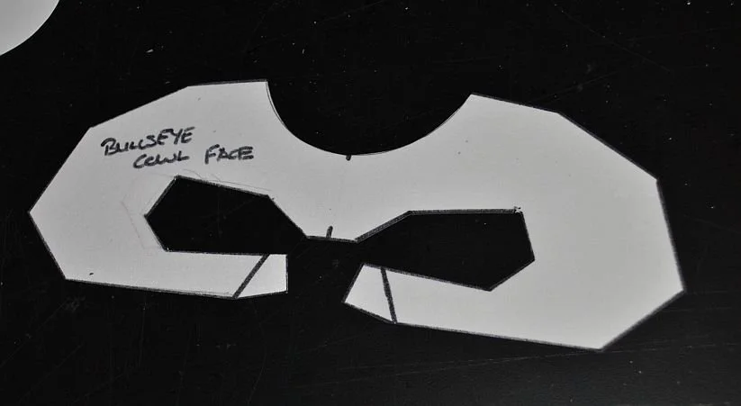The faceplate was then finalized and cut from 6mm EVA foam. The detail lines were cut into the foam with an Xacto knife, and the “rivet” details were made with a Dremel. Heat was applied to finish the details and allow for shaping. The faceplate will be coated with PlastiDip and painted before the final straps and clips are attached.