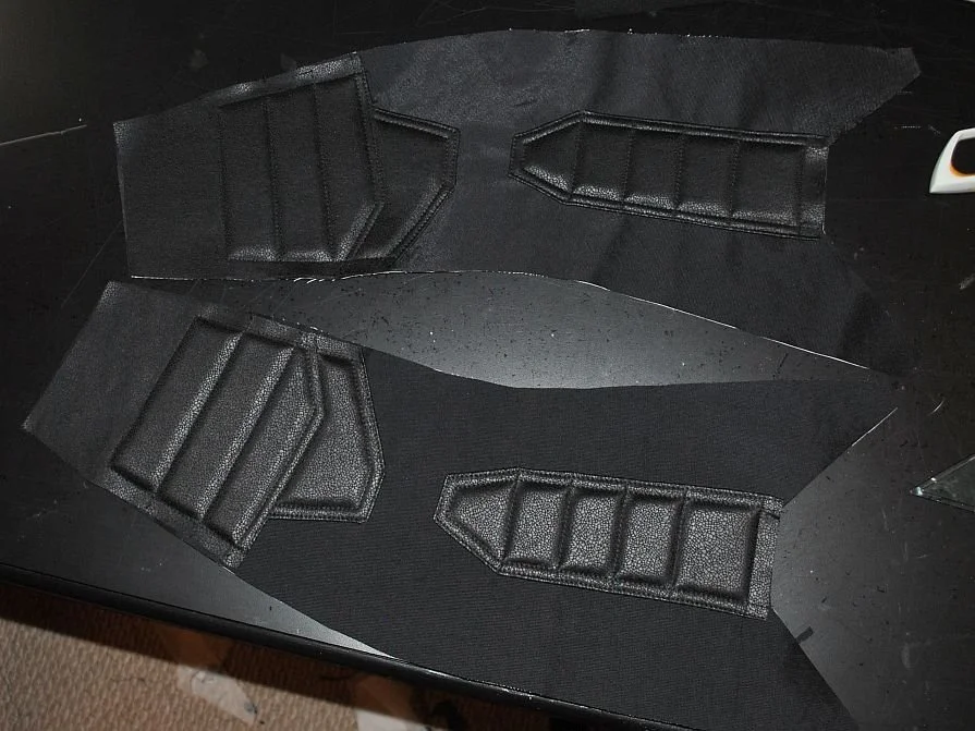 Once the top of the costume was complete. I moved on the the pants. The pants have faux leather details that tie into the vest. cordura panels with angled seam lines, feature stretch panels in the crotch and lower legs, and have elastic straps and clips around the thighs as in the source artwork.