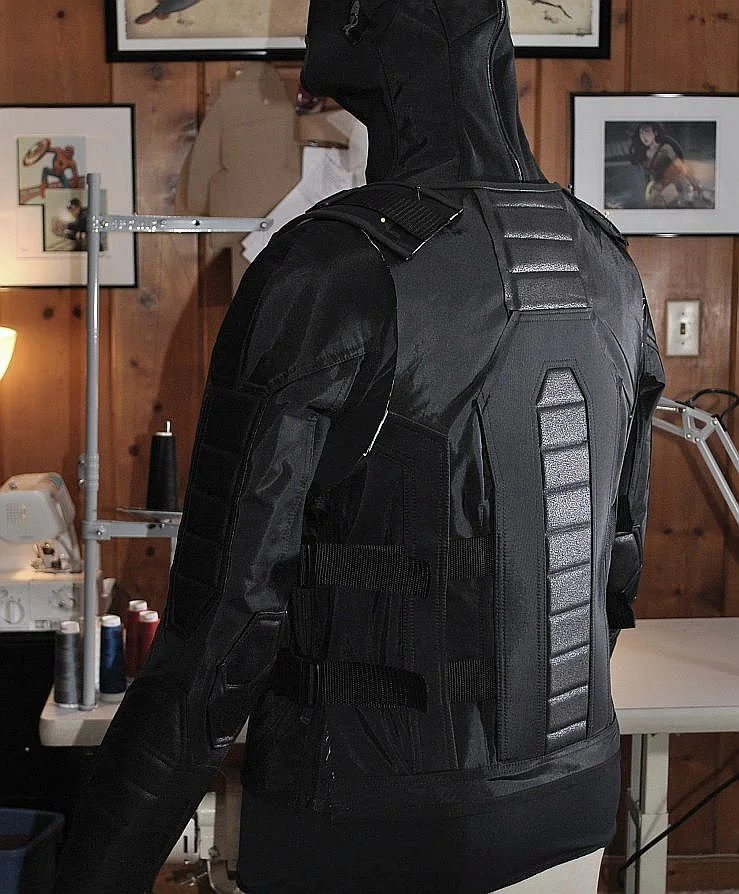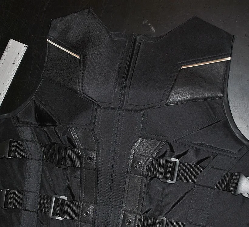 Next, I got started on the vest. The vest began with a base of black Cordura backed with black muslin, and then the rest of the detail layers were built on top of that.