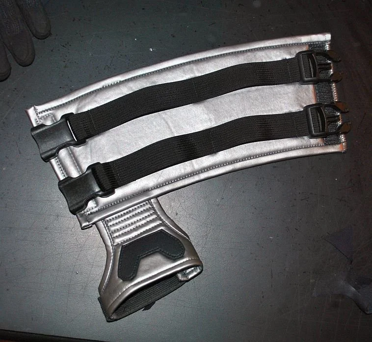 Bullseye has gauntlets, boot covers, a belt, and a leg holster. All of the pieces were created using a base layer of headliner (the belt has a base of upholstery-weight faux leather for stability) and were then built up with gunmetal faux leather and detailed with black straps and buckles.