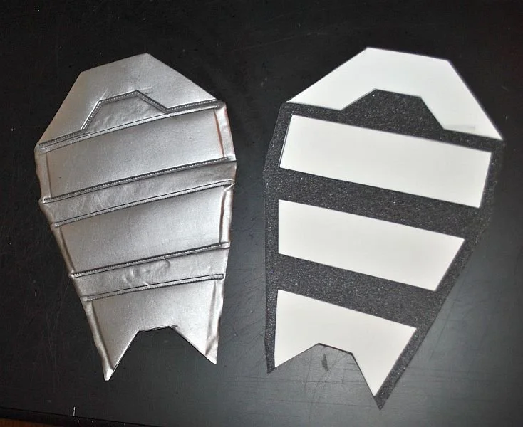 I began by taking the mockup apart and laying out the pattern. The cowl was then cut from the new pattern and built with Cordura, jumbo spandex, and faux leather with 2mm EVA foam.
