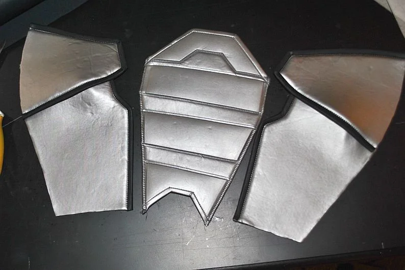 The base for the sleeves is Cordura, backed with muslin for the outer sleeves and faux leather on the undersleeves. I added the “armor” details using faux leather backed with headliner foam. There is also an inset of jumbo spandex at the back of the sleeves to aid movement.